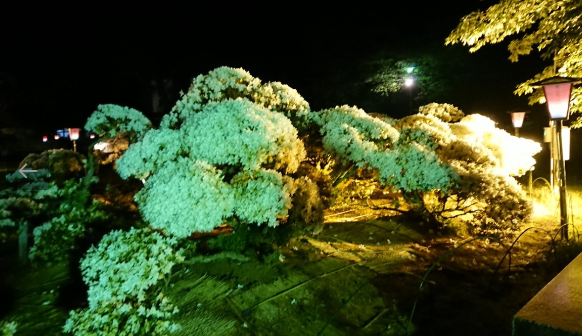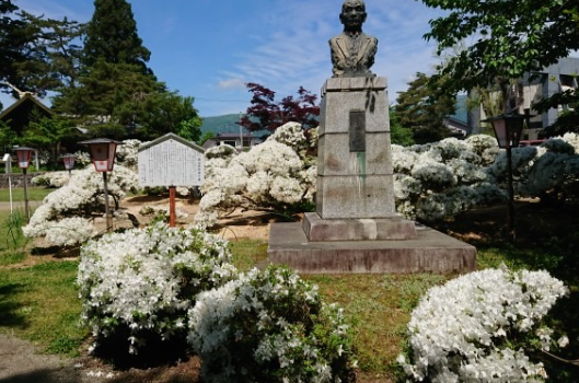 「白つつじ公園」園内中心部にある、樹齢750年といわれる琉球種の白つつじの古木群、27株が市の天然記念物に指定されています。樹高は1m以上、根元周は0.35m以上、東西の枝張り1m以上、株立数は2本以上あります。 天明3(1783)年の飢饉の際、現在の花作町の豪農鈴木七兵衛が、農民救済の事業として白つつじの築山を造らせ、その後、明治29年に、小出(こいで)地区にも名所を作ろうと、松ヶ池公園の整備が進められ、その白つつじを譲り受け現在の場所に移設されたのが、白つつじ公園の始まりとされます。 積雪前の雪囲い作業は、初冬の季節の風物詩となっています。