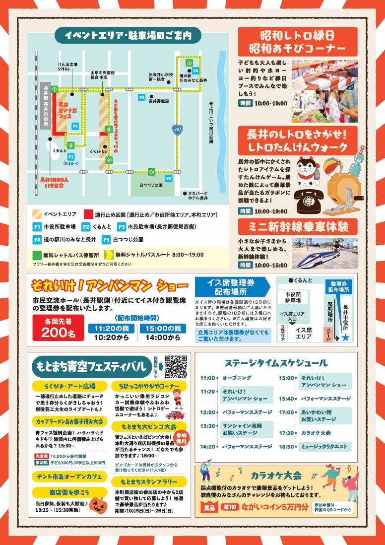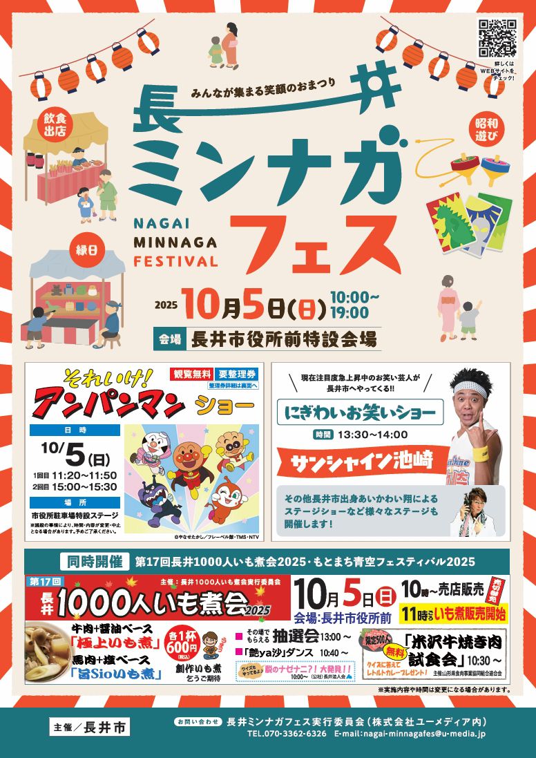 地域の魅力を再発見し、世代を超えて楽しめる「長井ミンナガフェス」。 今回は「第17回長井1000人いも煮会2025」「もとまち青空フェスティバル2025」との同時開催です! ■それいけ!アンパンマンショー 日時 10月5日(日) 1回目 11:20~11:50 / 2回目 15:00~15:30 観覧無料 観覧には整理券が必要です。 会場 市役所駐車場特設ステージ ※諸般の事情により、時間・内容が変更・中止となる場合があります。予めご了承ください。 ■にぎわいお笑いショー 現在注目度急上昇中のお笑い芸人が長井市へやってくる!! 【サンシャイン池崎 お笑いステージ】 ■昭和レトロ縁日・昭和あそびコーナー 子供も大人も楽しい射的や水ヨーヨー釣りなど縁日ブースでみんなで楽しもう! 長井のレトロをさがせ!レトロたんけんウォーク 時間 10:00~19:00 長井の街中にかくされたレトロアイテムを探すたんけんゲーム。 集めた数によって豪華景品が当たるガラポンに挑戦できるよ! ■ミニ新幹線乗車体験 時間 10:00~15:00 小さなお子さまから大人まで楽しめる、新幹線体験! ■カラオケ大会 採点機能付のカラオケで豪華景品をゲットしよう! 歌自慢のみなさんのチャレンジをお待ちしております。 賞品 第1位 ながいコイン5万円 ■第17回長井1000人いも煮会2025 会場:長井市役所前 いも煮販売開始は11頃です! △▼△▼△▼△もとまち青空フェスティバル2025▼△▼△▼△▼△▼ 場所 本町大通り商店街 ・らくがき・アート広場 ・カップラーメン&お菓子積み大会 先着順→13:00から受付開始 《参加料:こども300円・中学生以上500円》 ・テント市&オープンカフェ ・商店街を歩こう 当日参加、仮装も大歓迎 ≪お問い合わせ≫ 長井ミンナガフェス実行委員会