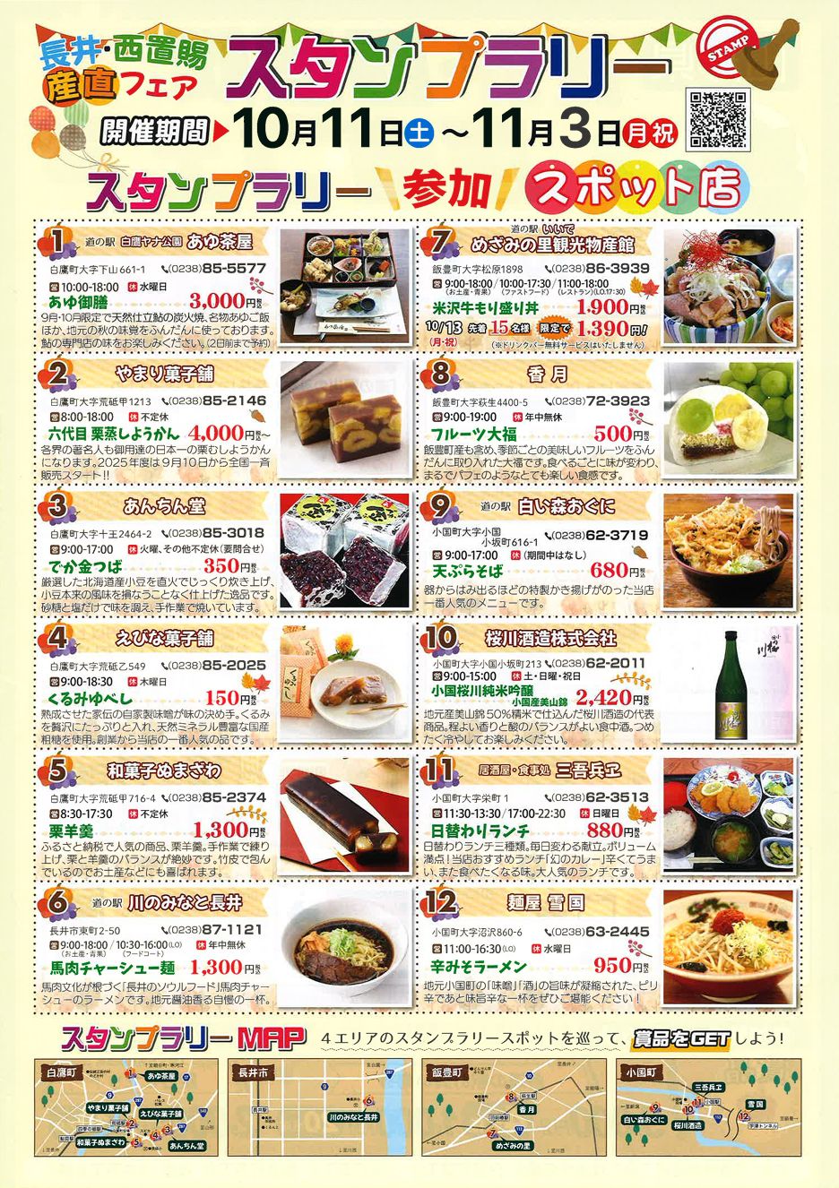 〈2025年〉10/11(土)・12日(日)・13日(月・祝) 「山形県 長井・西置賜産直フェア」を開催します! 期間中、長井・西置賜の道の駅ではプレゼント企画やお得なサービスをご準備! <道の駅川のみなと長井>では、2,000円以上お買物していただいた方先着30名様に 10/11(土)「つや姫」2合パック 10/12(日)「雪若丸」2合パック プレゼント! (※各日9:00~限定数終了まで) 小国・飯豊・白鷹の各道の駅でもプレゼントやサービス企画あり! ※いずれも数量限定 ★☆【スタンプラリー】☆★ 同時開催! <開催期間10/11(土)~11月3日(日)> 道の駅のほか、スポット店(※)にて『3個以上』スタンプを獲得すると、お買物券や詰合せセットなどが当たるデジタルスタンプラリーを開催! ぜひ各スポットを巡りがらお楽しみください! 長井・西置賜へどうぞお越しください! お待ちしております(^_-)-☆ 主催:西置賜地区商工会広域連携協議会・白鷹町商工会・小国町商工会・飯豊町商工会  後援:長井商工会議所