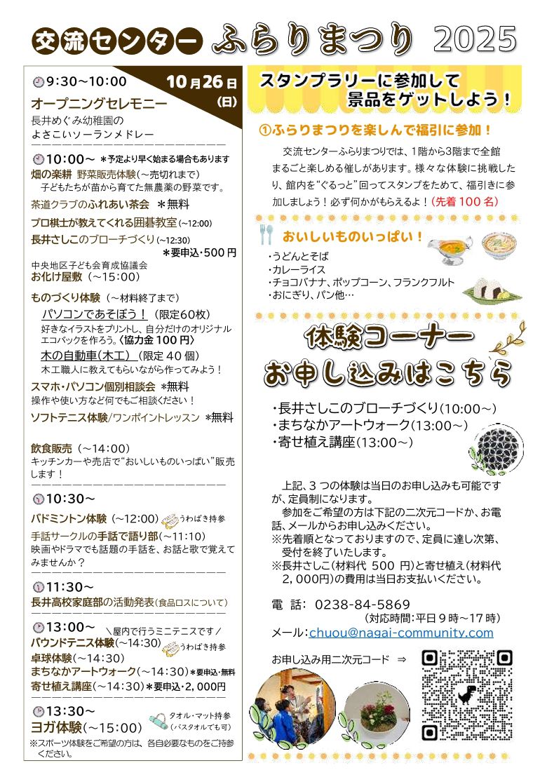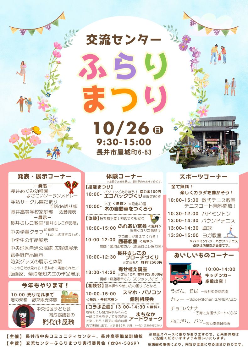 今年も交流センターふらりまつりの季節がやってきました! 長井市中央コミュニティセンターと長井高等職業訓練校の合同の文化祭です。 (一財)文教の杜ながいと共催して行うまちなかアートウォーク、体を動かす体験(バドミントン、卓球、ヨガ、バウンドテニス、ソフトテニス)、ものづくり体験(長井さしこ、木工、アイロンプリント、寄せ植え)、長井めぐみ幼稚園や手話サークル「陽だまり」、長井高校家庭部の発表や地域のみなさんの作品展示、など楽しいことが盛りだくさん!お茶会やお化け屋敷、スタンプラリーに福引、おいしい食べ物の売店もありますよ。 盛りだくさんな内容がギュッと詰まった1日です。みなさまお誘いあわせのうえ、ぜひご来場ください。 主催:長井市中央コミュニティセンター、長井高等職業訓練校 主管:交流センターふらりまつり実行委員会(長井市屋城町6-53 電話84-5869) ※駐車スペースに限りがありますので、ご来場の際はご配慮くださいますようお願いいたします。 ※諸般の事情により、内容が変更になる場合があります。