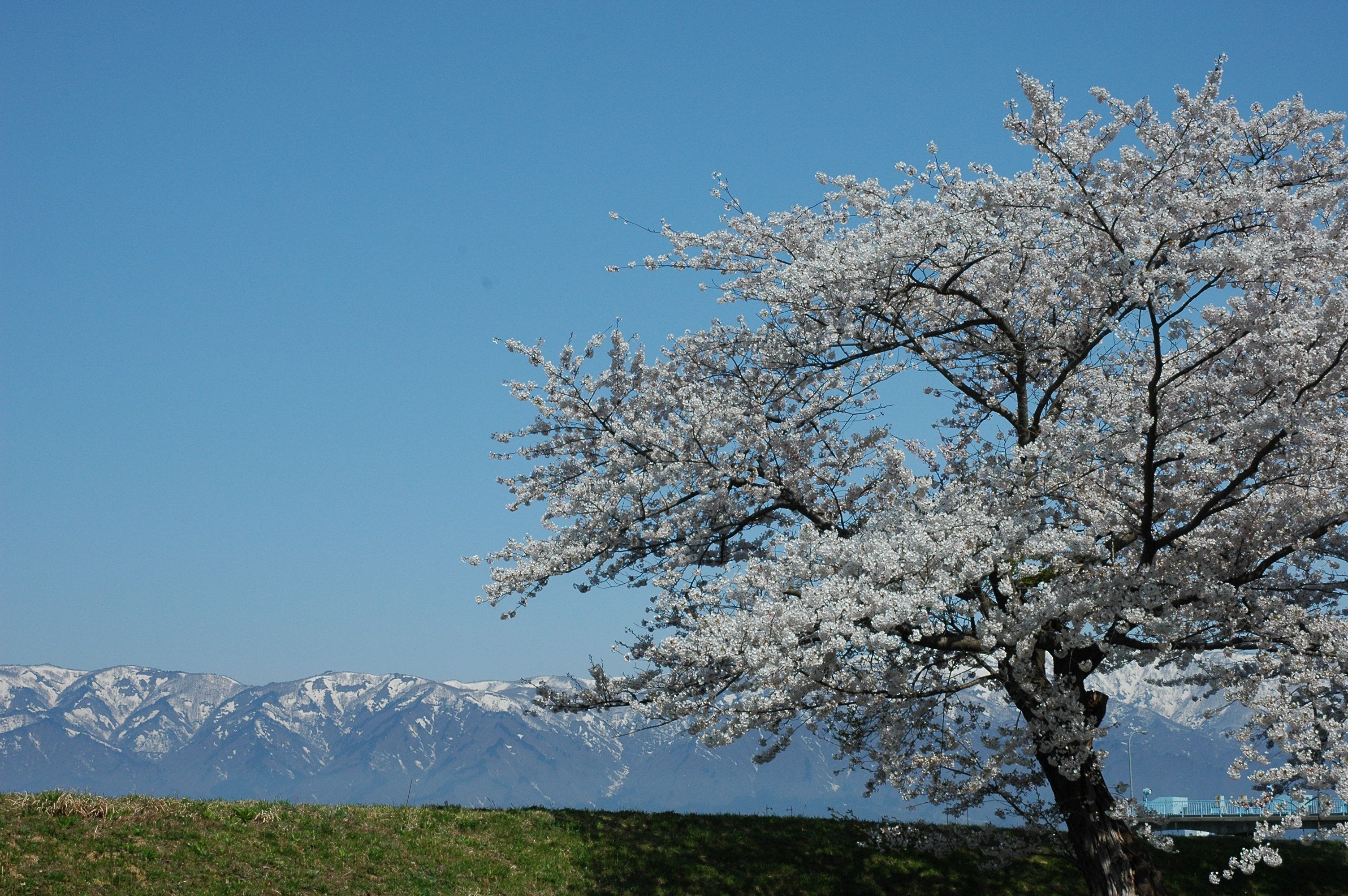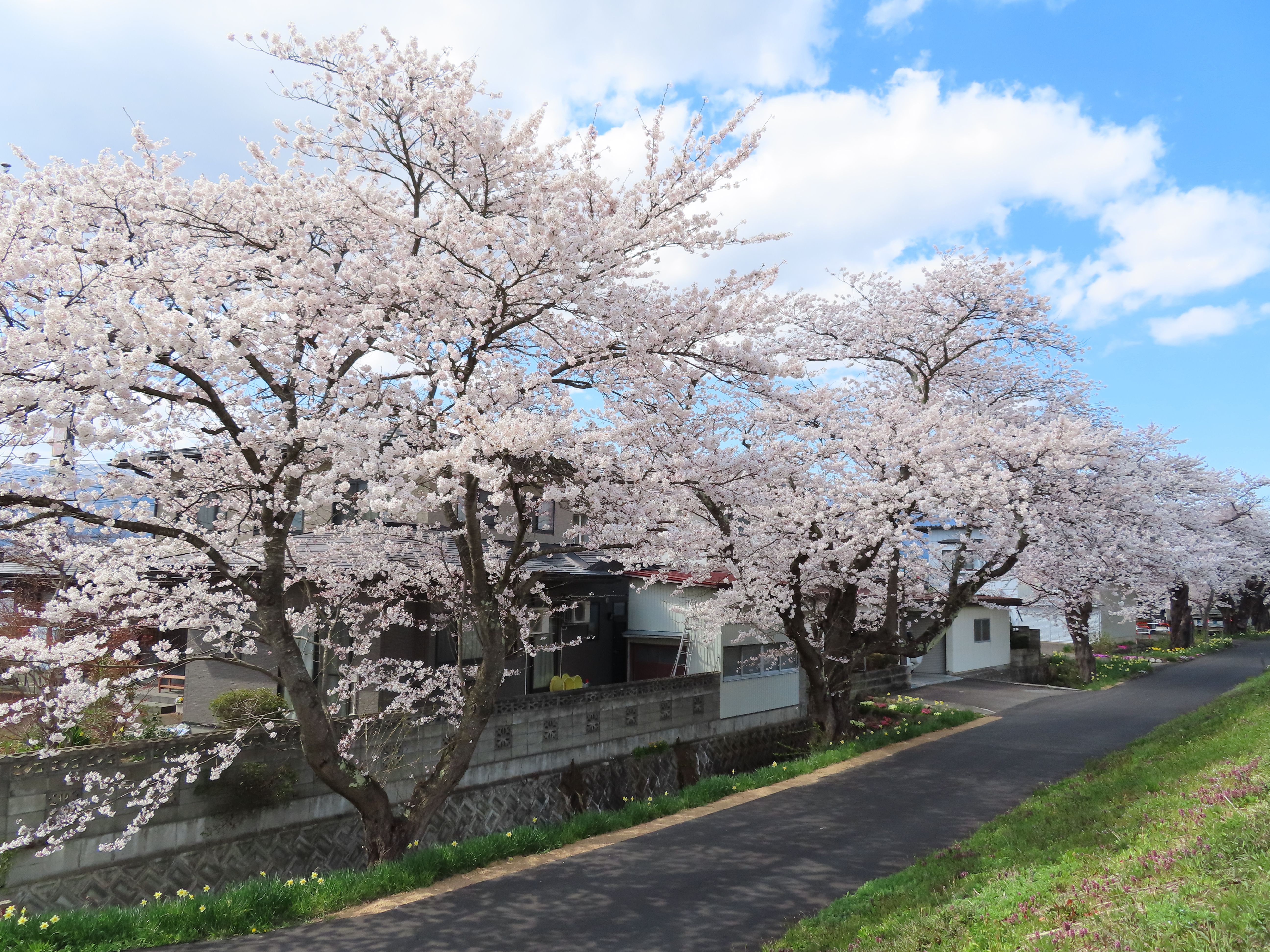 最上川の堤防沿いに桜並木があります。現在、その両岸の桜を「最上川堤防千本桜」と呼び、春には桜下を散策することができます。 最上川の市街地側の桜は、大正4年に地区民の発起によって天皇即位を記念して植えられました。樹種はソメイヨシノ。約1㎞に7.2m間隔で植えられ、特に松ケ池公園の東側には太い苗木を植えたといいます。早く桜を楽しめるように、との気持ちからだったようです。